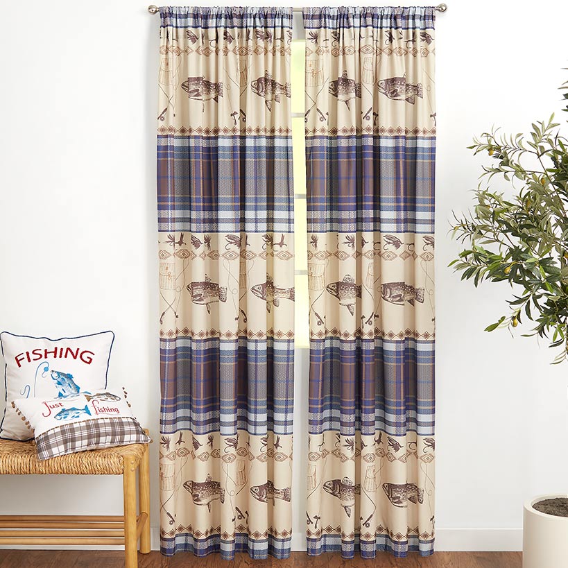 Refresh any room of the house with the cabin window decor style of the Fly Fishing Window Panel 50″ x 63″ or 50″ x 84″. Rustic curtains feature fish, flies, fishing poles and plaid. Enhance the ambiance of your home or cabin with this rustic curtain set, perfect for adding a touch of warmth and outdoorsy charm.