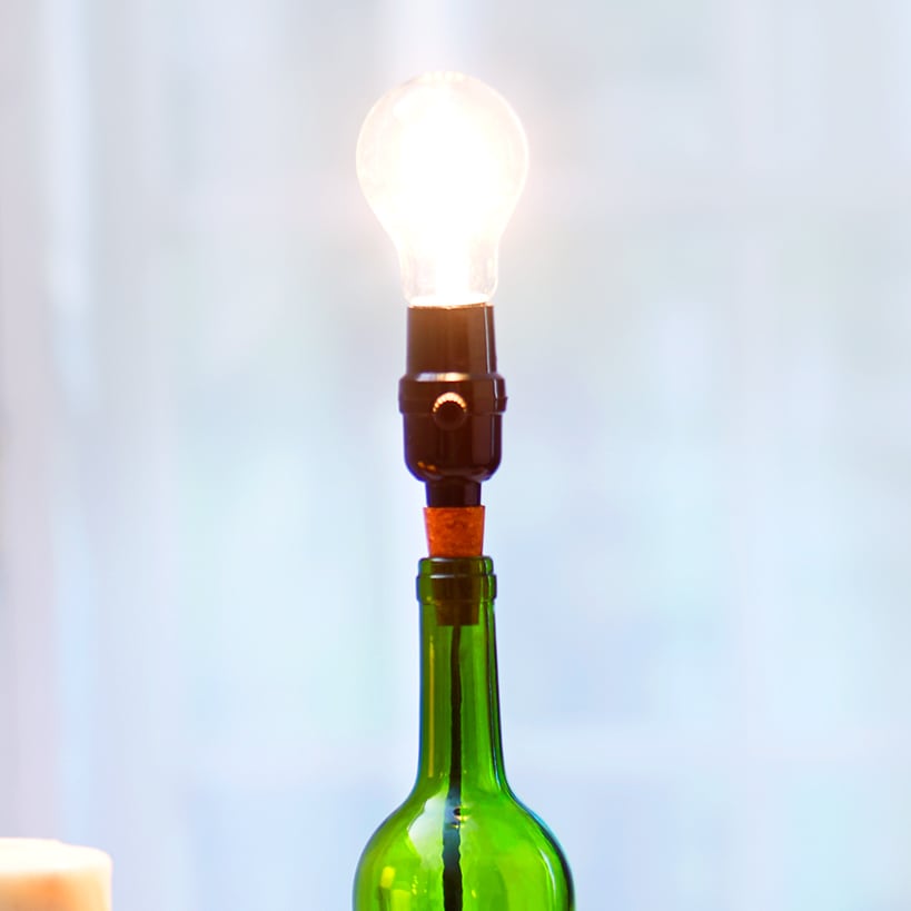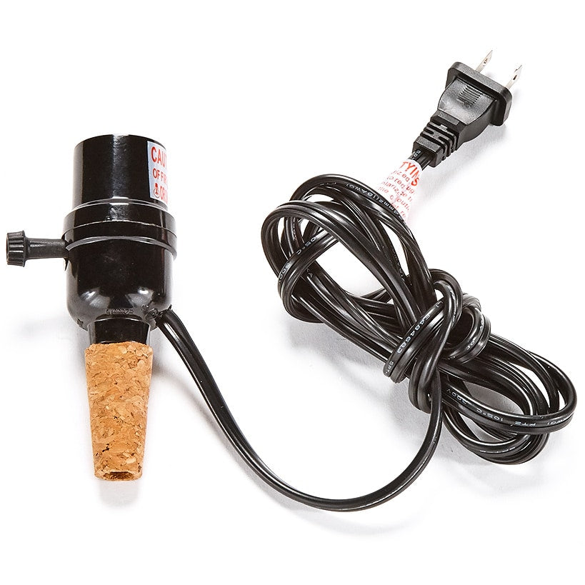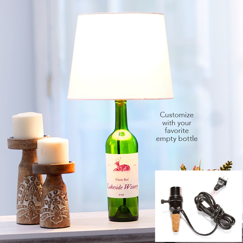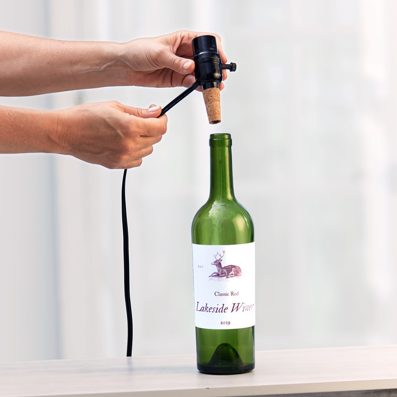 Transform an empty wine bottle into a decorative home accent with this Wine Cork Lamp Kit. The kit includes a cork insert and a power cord. Place the insert into your own bottle and add your own lamp shade. Then plug it in and turn it on.